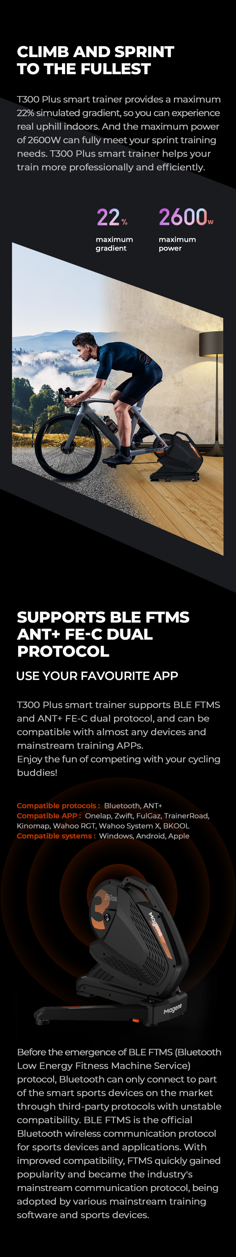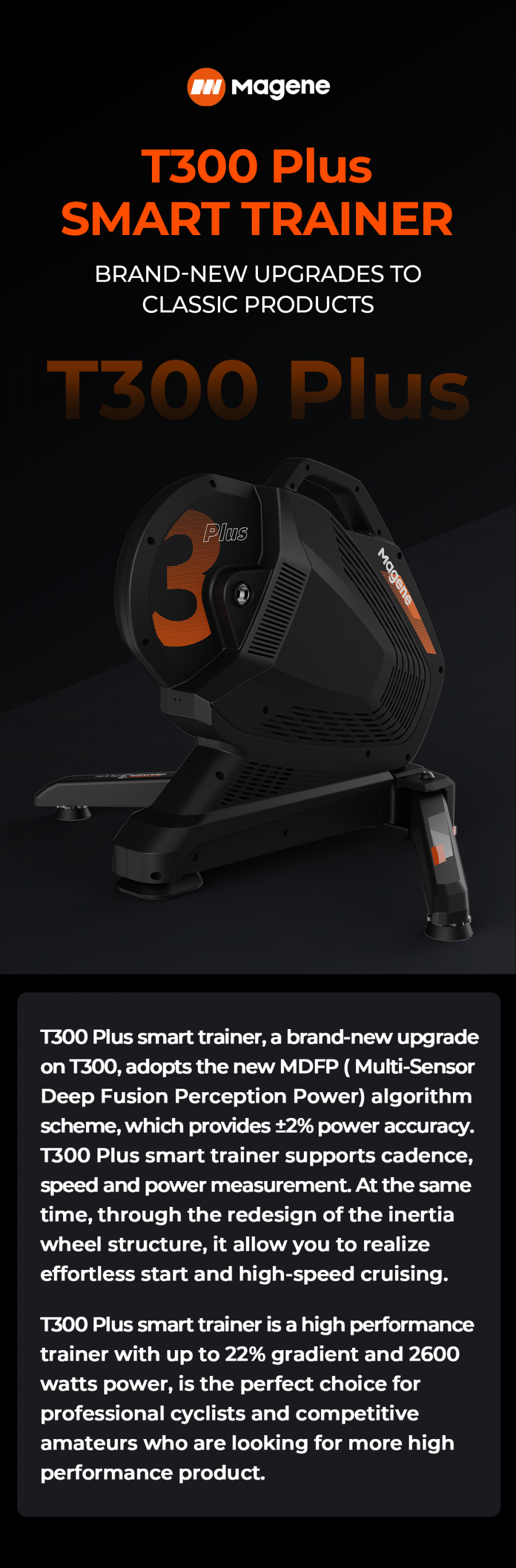T300 Plus smart trainer is a high performance trainer with up to 22% gradient and 2600 watts power, is the perfect choice for professional cyclists and competitive amateurs who are looking for more high performance product.