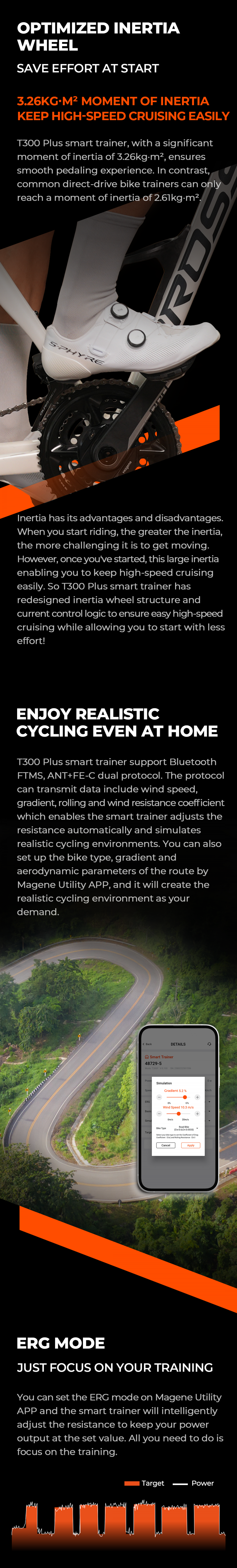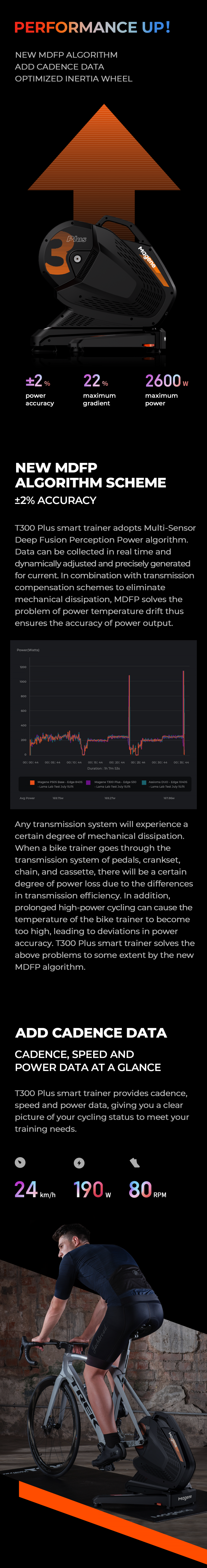 T300 Plus smart trainer, a brand-new upgrade on T300, adopts the new MDFP ( Multi-Sensor Deep Fusion Perception Power) algorithm scheme, which provides +2% power accuracy. T300 Plus smart trainer supports cadence, speed and power measurement. At the same time, through the redesign of the inertia wheel structure, it allow you to realize effortless start and high-speed cruising.